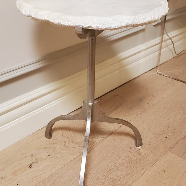 - This chic accent table pairs hammered steel with white alabaster marble for a luxurious modern look with a unique character.