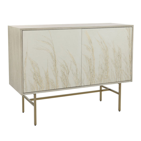- A sleek, minimalistic stainless steel base features four slender legs in a brass finish complement the pair of gilded doors