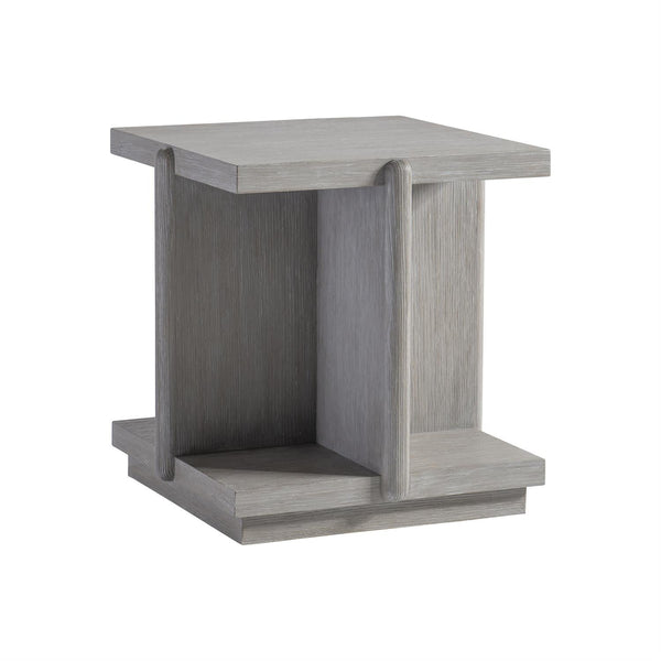 - The Sereno side table has a partitioned wood base that offers open storage.