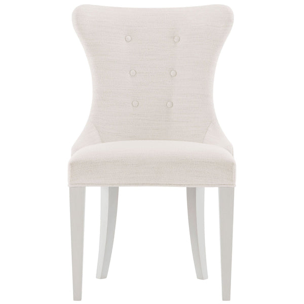 - This upholstered side chair abounds with delightful touches: a button-tufted hourglass shaped back, and rear sabre legs that contrast with its front tapered legs.