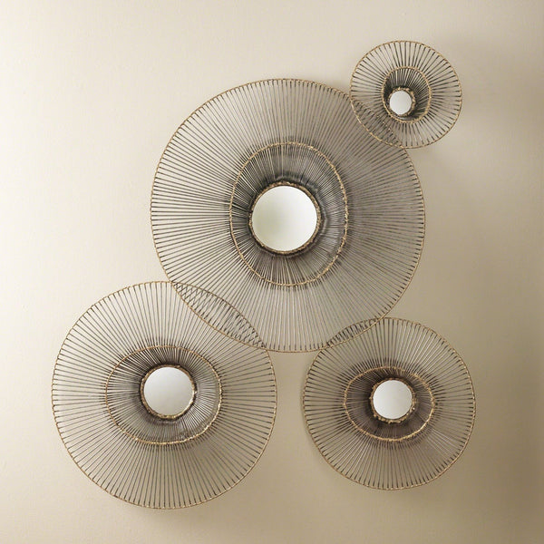 - Floating open wire vessels frame a mirrored center to create a tilted wall perspective.