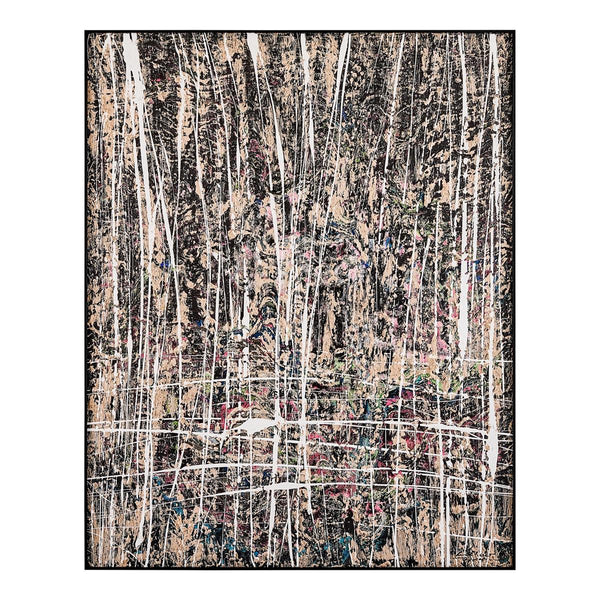 - This piece in acrylic paint on canvas depicts black and beige tones overlain with several white streaks