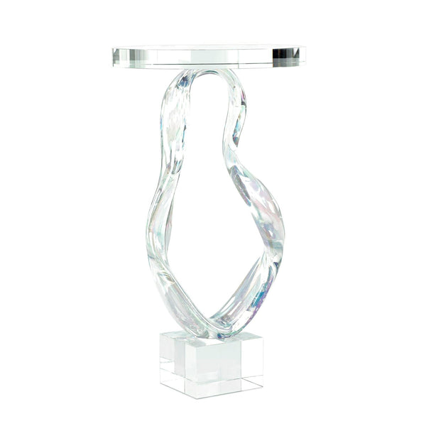 - The piece sits atop a square base of clear crystal, matched by the circular tabletop above.