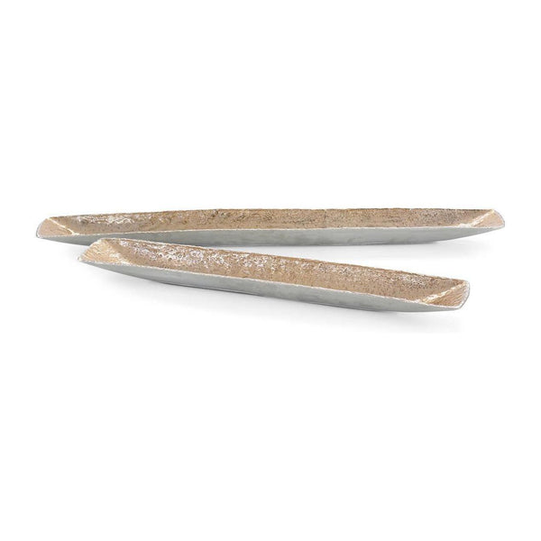 - This set of two long and narrow trays, with the texture of moon rocks and a warm luster gold finish on the insides and silver finish on the outsides, is exceptionally versatile.