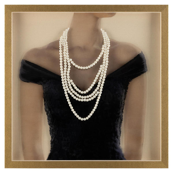 - The subject’s neck is embellished with pearls, giving the piece a dimensional look