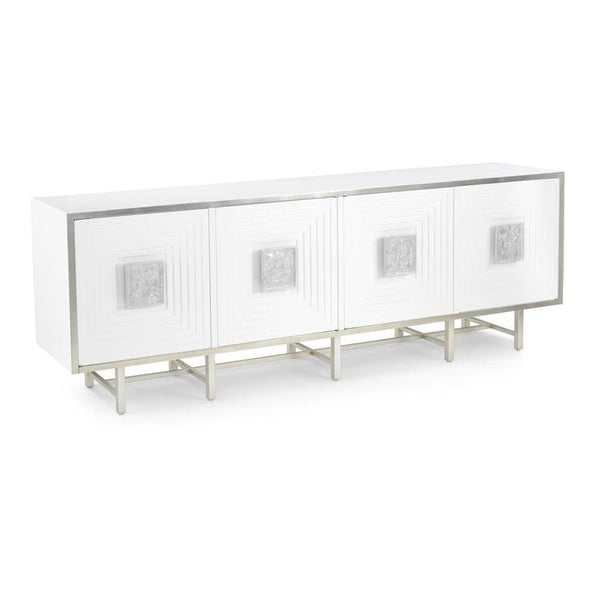 - Set on a steel base in pewter silver, the four doors of this impressive sideboard feature a pattern of squares reducing in size as they increase in depth.