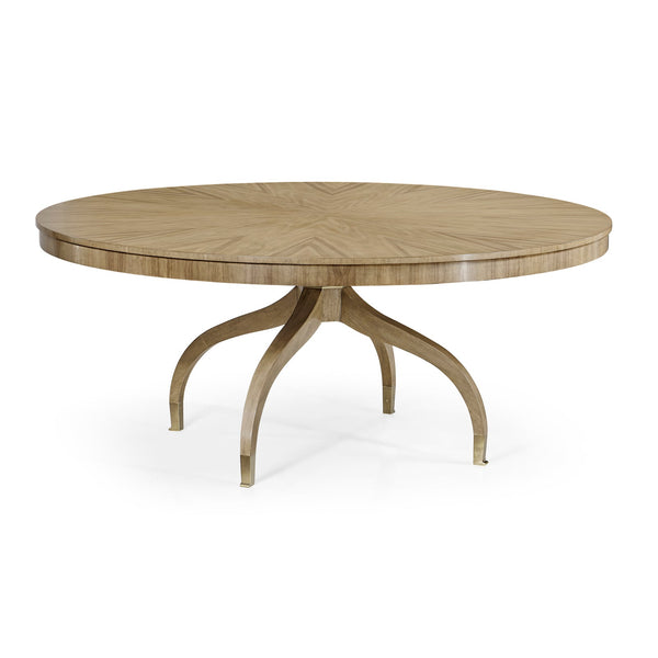 - Classically styled 72 inch round bleached walnut dining table with cast brass ferrels.