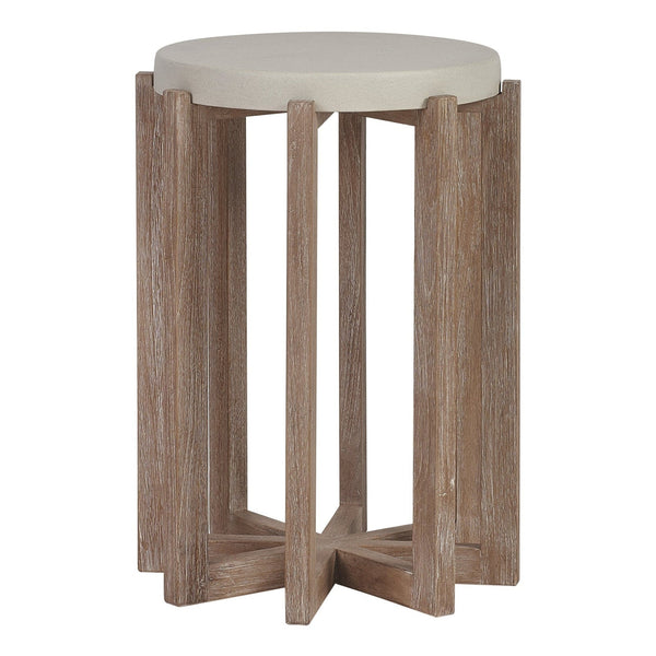 - The 14-inch diameter accent table, which is ideal for drinks, features a weather resistant limestone resin top.