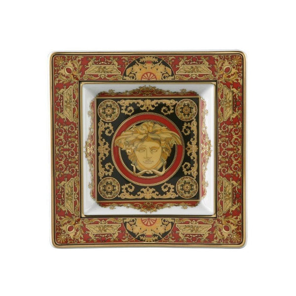 One of the first sets of the collection "Rosenthal meets Versace”, the décor "Medusa” by Gianni Versace on the form of the "Ikarus” mirrors the matchless rich, color intensive world of Versace. Central eye-catcher of this collection is a glorious gold colored head of Medusa, an unmistakably Versace emblem, framed by expressive baroque ornaments. The centrally placed head of Medusa decorates all cups, pots, service and breakfast plates of the collection "Medusa”. Varacious aristrocratic colors, bright red, precious gold and black with lavish delicate designs and ornaments give the head of Medusa a colorful elegant framework.