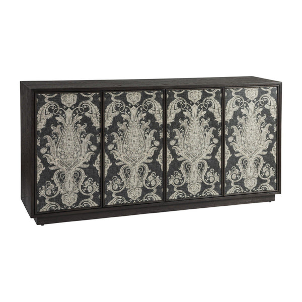 - Features four wood framed fabric covered doors, four adjustable shelves, a ventilated back, and a recessed plinth base.