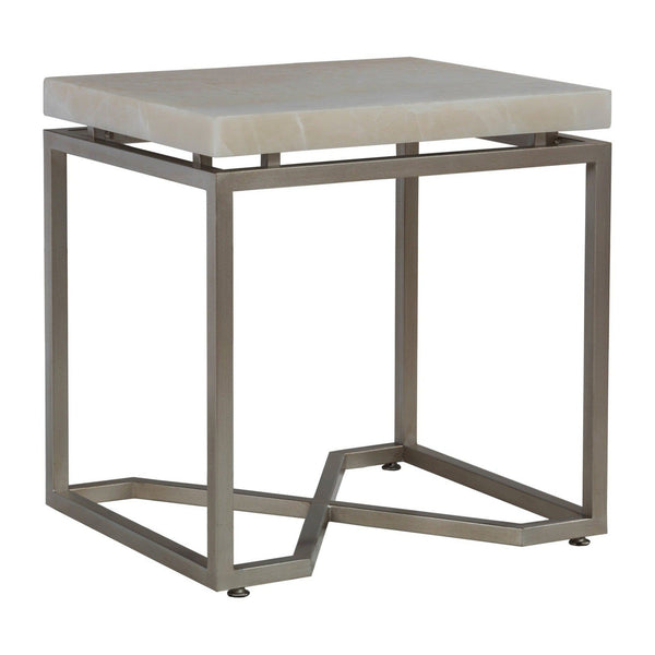 - Contemporary designs in iron finished in a champagne silver leaf and completed with thick mitered tops of solid white onyx with a light amber hue and translucent figuring.