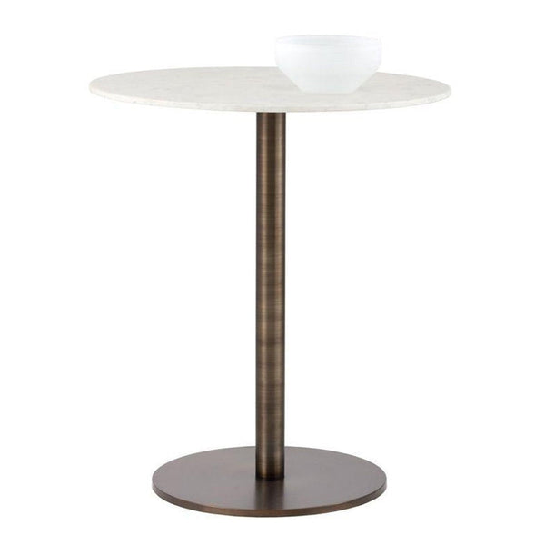- An Art Deco inspired round bar table from our Ikon collection, featuring a solid carrara marble top with an antique bronze steel base.