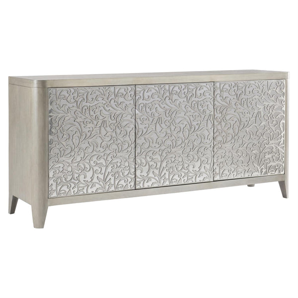 - Three push-to-open doors covered in raised acanthus leaf metal frieze