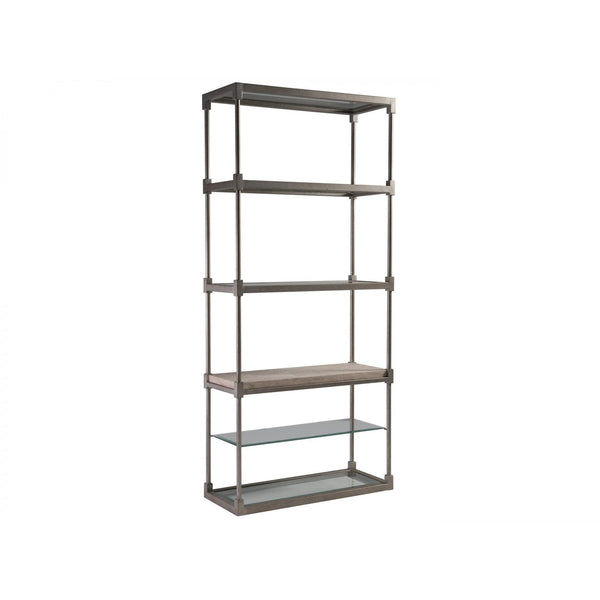 - Transitional design in antiqued silver leaf finished iron base with a sand travertine shelf and four tempered glass inset shelves with 1-inch bevel.