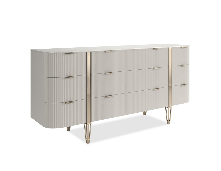 Dark and stately, Love At First Sight takes on a sultry demeanor that accentuates the exquisite reeding on the drawer fronts with Whisper of Gold metal band detailing and designer legs. The piece has a gracefully rounded rectangular profile with nine drawers are felt-lined with under-mount guides.