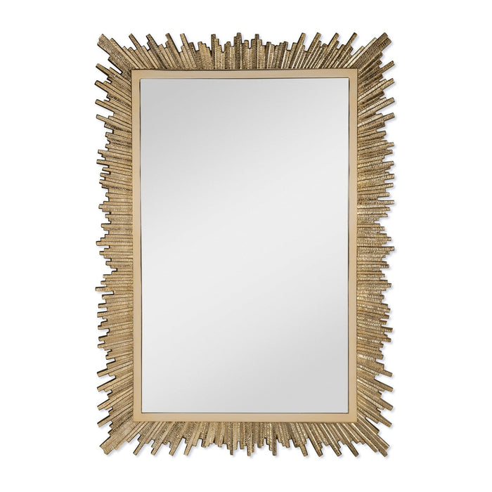 - The Ember mirror features individual pieces of Antique brass framing cut at varying lengths surrounding a rectangular clear mirror field.