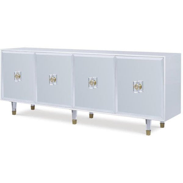 - A large four door credenza, Margot features beveled edge clear mirror on the doors with six acrylic feet that taper down to brass sabots.