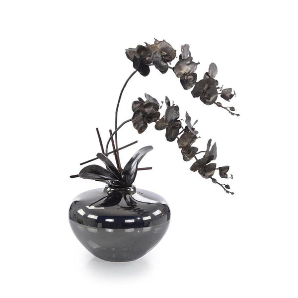 - Platinum phalaenopsis orchids and foliage are in an glazed ebony vase.