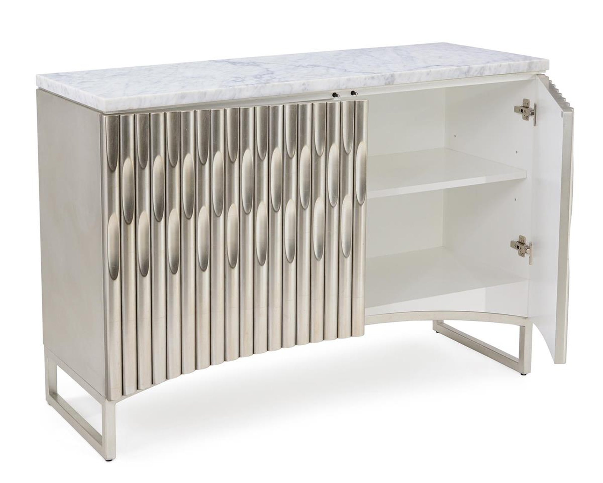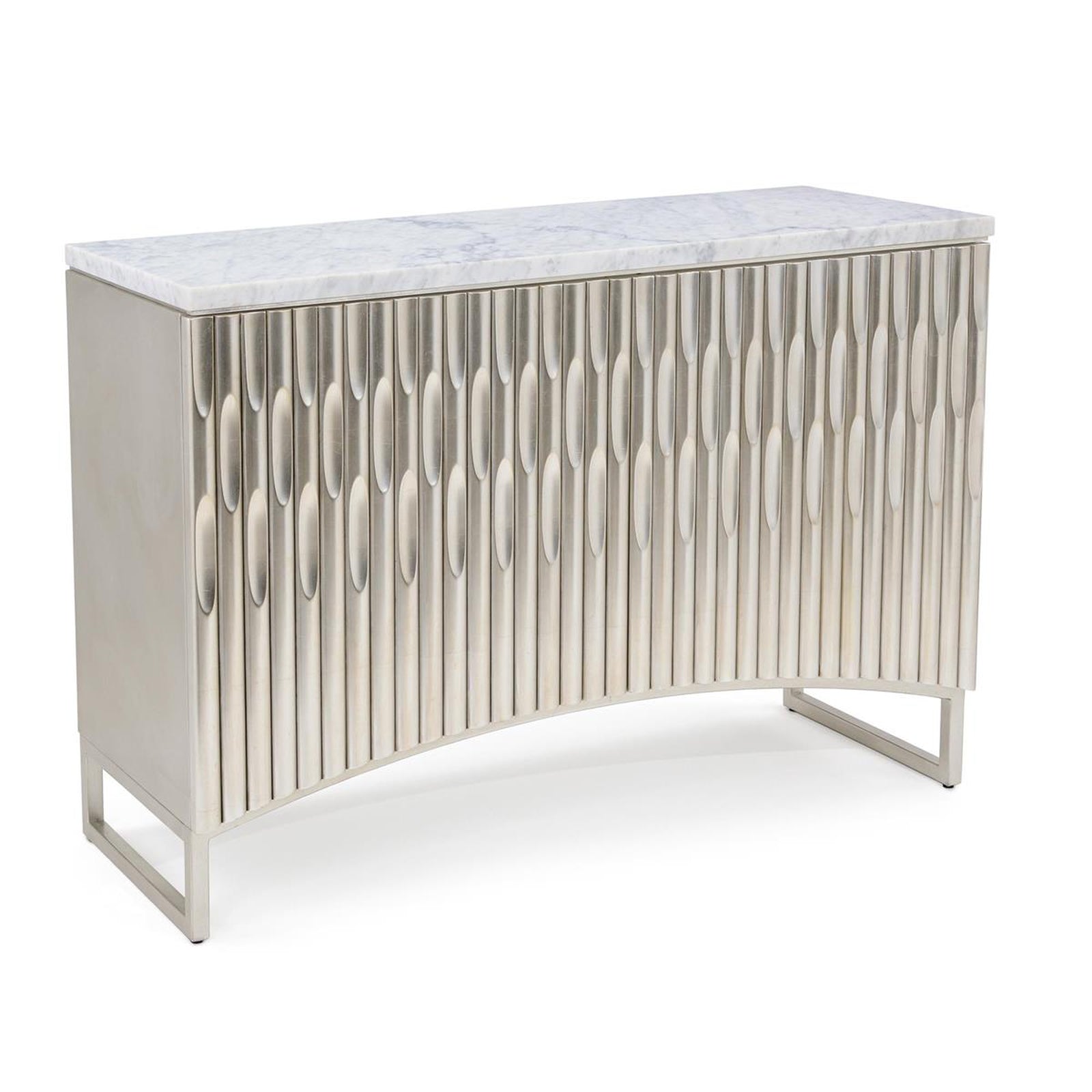 - This two-door chest features door fronts with ribbed detailing and concave accents at the top.