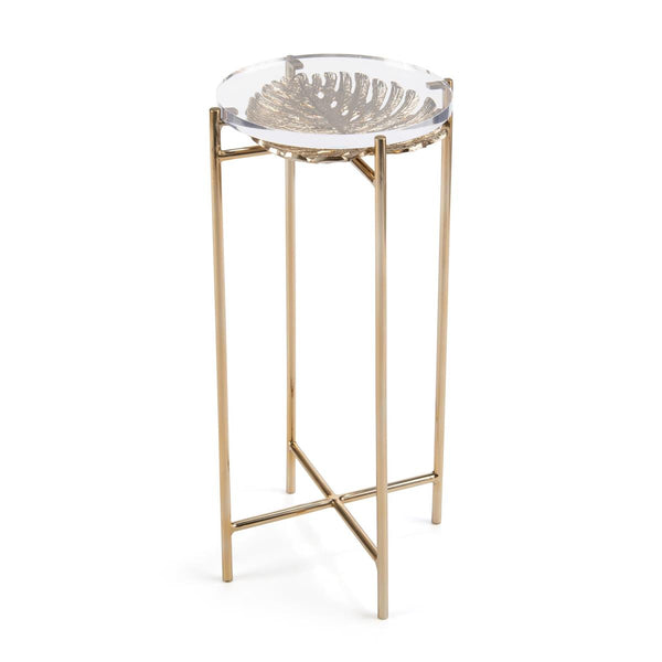 - The Palm Accent Table features a minimalistic base of stainless steel in a brass finish
