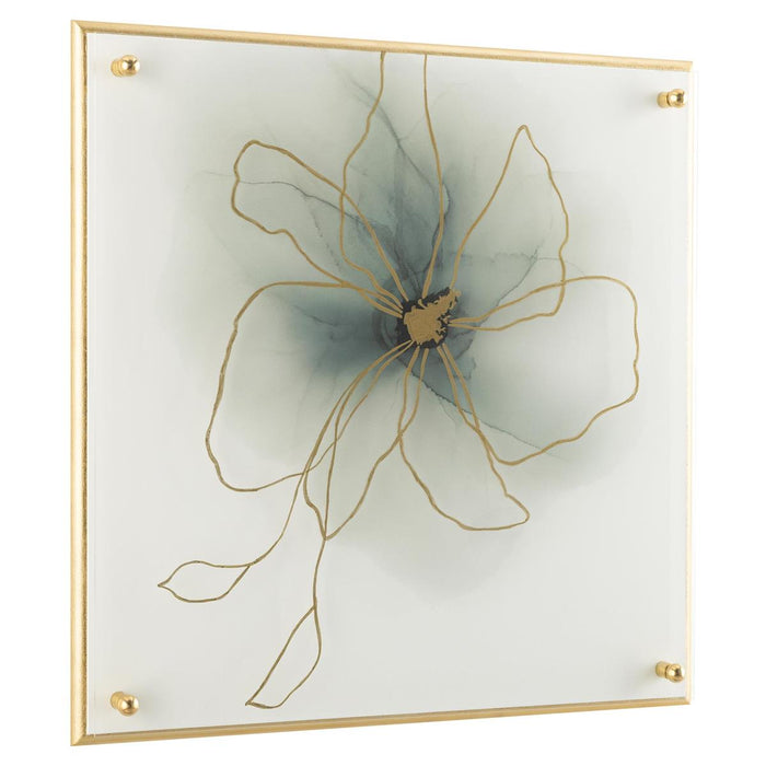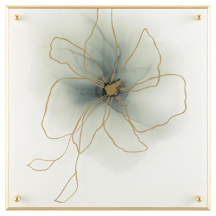 - This dimensional piece is affixed to an acrylic panel with gold standoffs and matching gold leaf trim, completing the look.