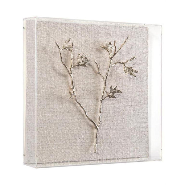 - A twisted natural silver branch is mounted on a pearl white, textured panel and displayed in an acrylic frame.