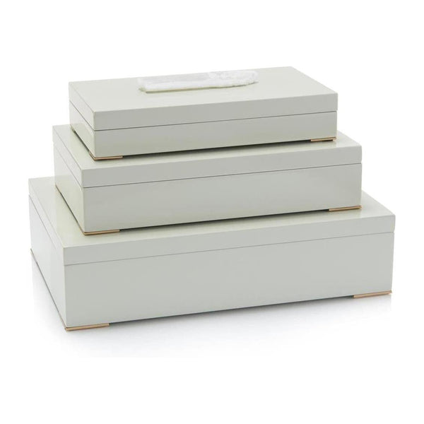 - A set of three enameled boxes stack beautifully and are topped with a translucent selenite handle.