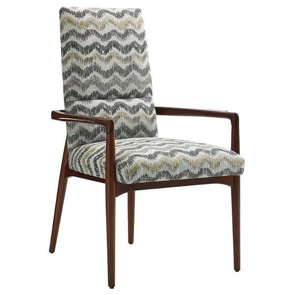 - A fresh take on the familiar, this dining arm chair features unique / distinct back supports and an upholstered channeled back creating a fresh, contemporary look.