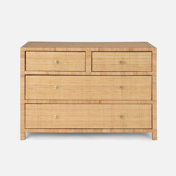 - A tightly wrapped, natural peeled rattan frame complements the dense basket weave of the natural peeled rattan top, side, and shelves.