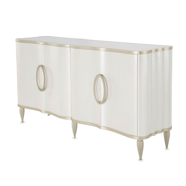 The London Place Sideboard is the perfect addition to any dining room looking to elevate its style. With its pearly finish and sophisticated hardware, this piece is a showstopper that will impress all your guests. The scalloped design adds a touch of elegance to the overall look, making it a must-have for anyone who wants to add some refined glamour to their home decor. This sideboard offers ample storage space with its drawers and cabinets, making it functional as well as beautiful. It's perfect for storing your dining essentials such as linens, silverware, and dishes, keeping everything organized and at your fingertips.
