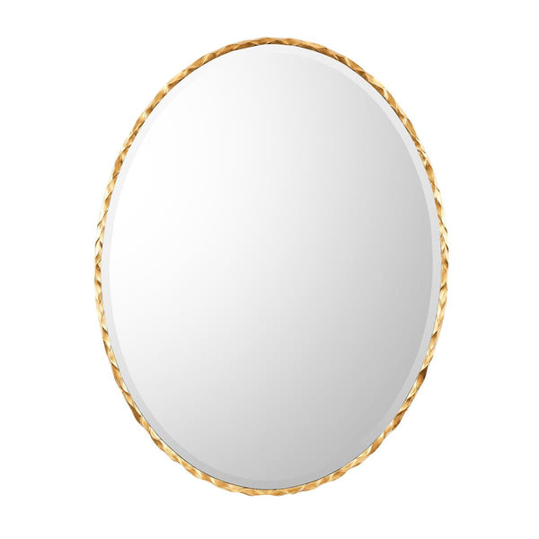 - An ovate, beveled mirror is surrounded by a beech wood frame with textural detailing in a Gold Coast finish