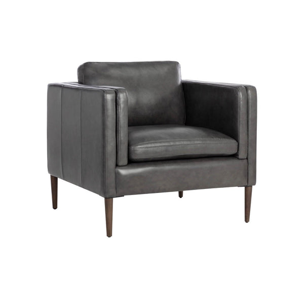 - Designed with a sleek silhouette in cortina black leather and dark brown solid wood legs.