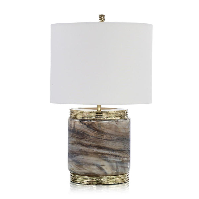 - The lamp features Polished Brass accents with a textural, ringed look at the base, neck, and cylinder finial