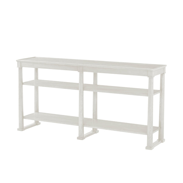 - In the Surrey Sofa Console Table II, symmetrical lines seamlessly complement a rich oak surface and columns, with ends detailed in finely squared accents.