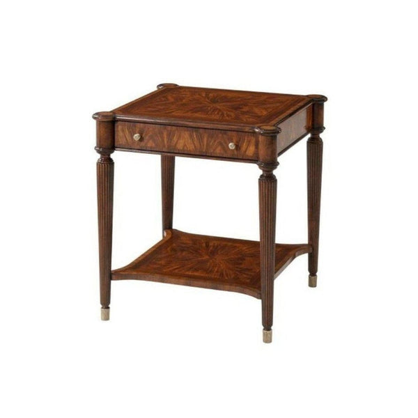 - A fine flame veneered, satinwood and morado crossbanded lamp table, the square top with rounded protruding corners above a frieze drawer with brass handles, on reeded tapering legs joined by a concave sided undertier, on reeded brass feet.