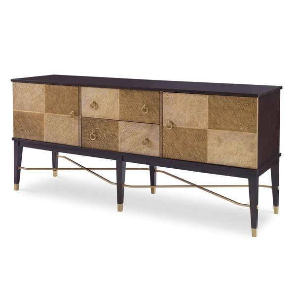 Etched gold leaf doors add rhythm and texture to this two door, two drawer cabinet. Gold X shaped stretchers pierce tapered wood legs. Brass ring hardware.