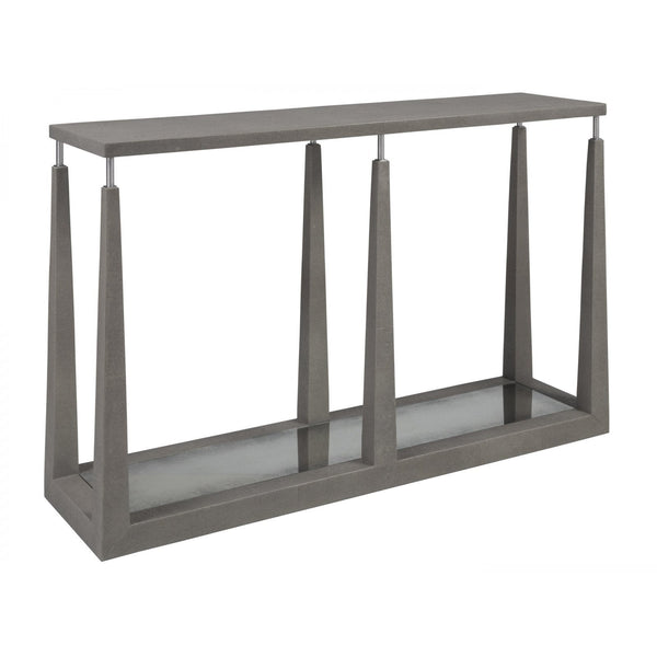 - Crafted from faux Shagreen in a warm gray finish with antique mirror deck, six reverse tapered legs, and polished stainless steel accents.