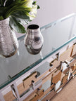 - The Cityscape console table features six-sided blocks of stainless steel in a three-dimensional intersecting pattern, highlighted by select portions accented in a warm brass finish.