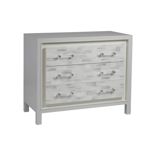 - Faux horn motif hand-painted by artists on individual resin tiles in a dark gray bone coloration with custom acrylic hardware and bright nickel finished clasps which are located on each of the three drawers.