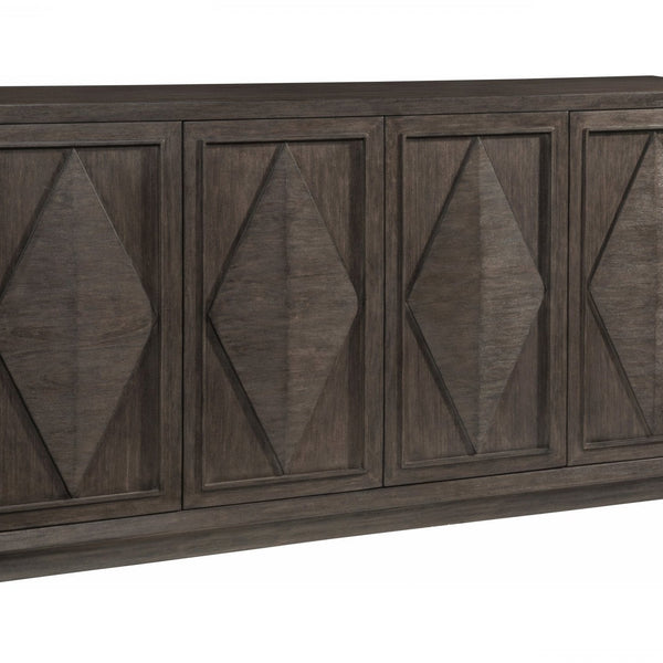 - The four doors have a diamond pattern overlay, and open to two felt lined drawers (one divided for silver), four adjustable shelves, sliding ventilated back panel for wire management.