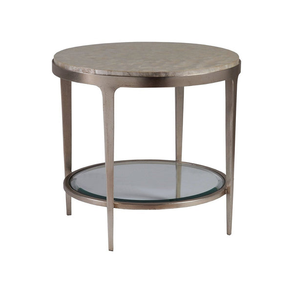 - Capiz shell inlay top graduating to a center sunburst pattern on a hand-forged iron base in a champagne foil finish, with a tempered inset glass shelf below.