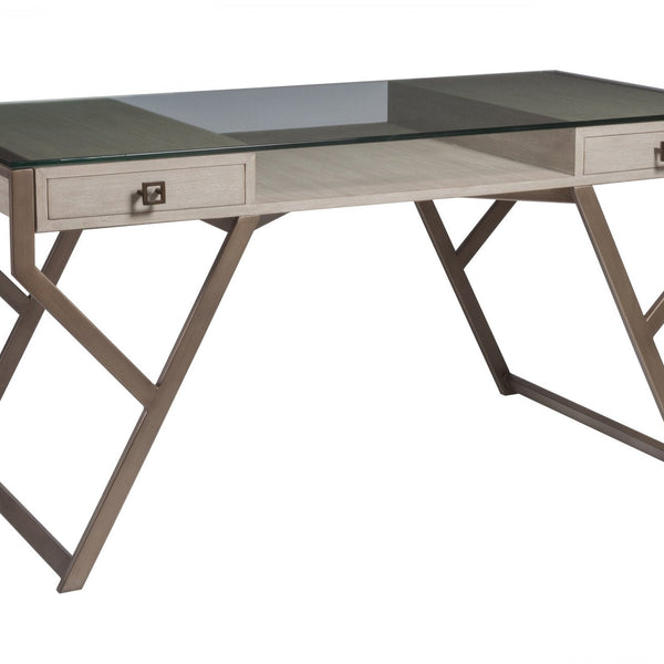 - Contemporary writing desk crafted from Mahogany solids and veneers with a warm metallic finished frame and hardware and a tempered glass top.