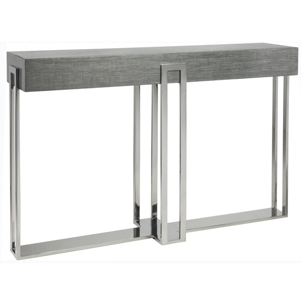 - Contemporary design slab top is Beech solids and Maple veneers hand-painted by artists in a gray and silver crosshatch pattern over silver leaf, enhanced by a true lacquer finish.