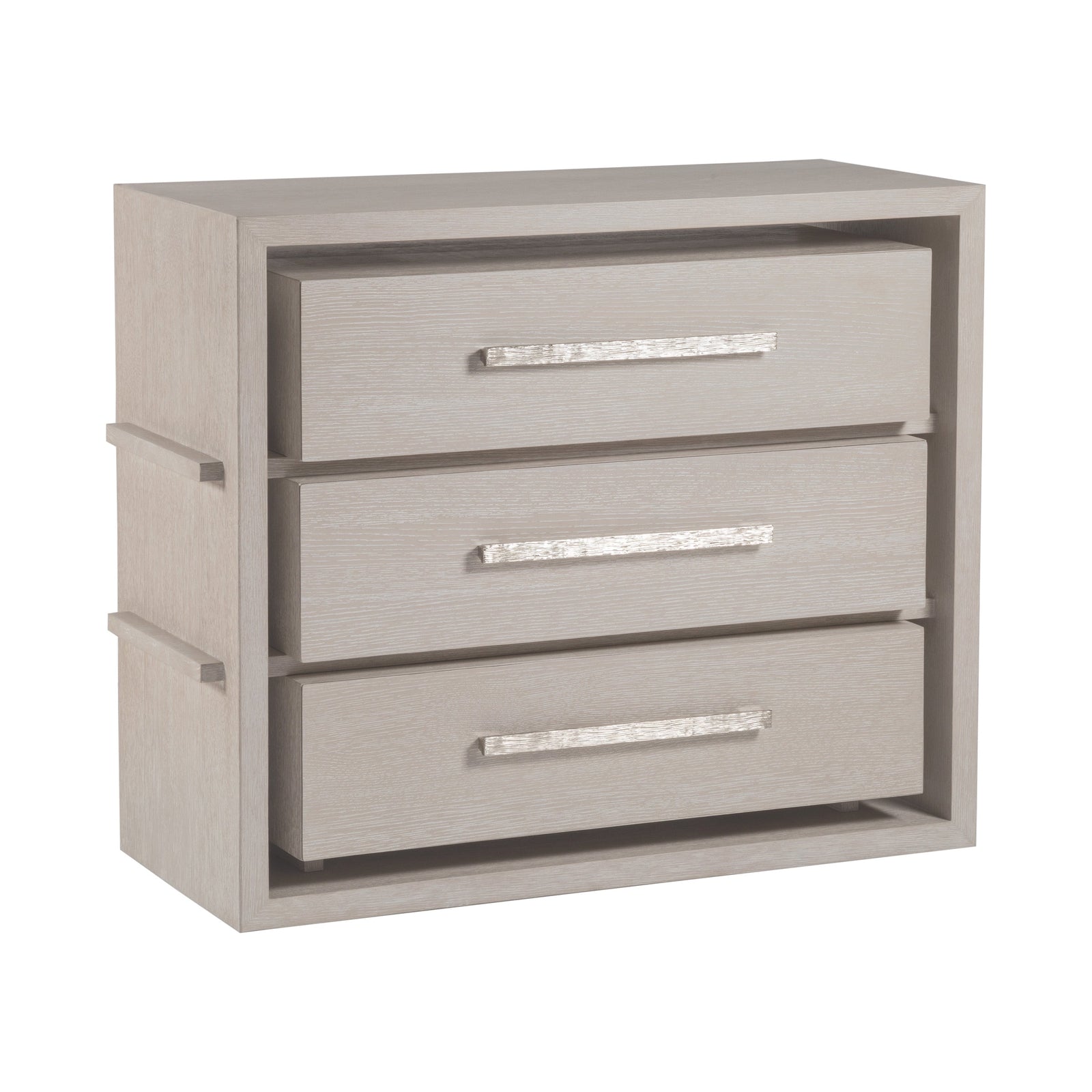 - Features intersecting parting rails suspending the drawer box, soft-close drawer guides, nickel hardware.