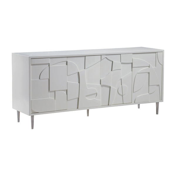 - Sleek cabinet featuring cast door fronts in a single Post-Modern abstract relief carving spanning the entire face, creating dramatic dimensionality.