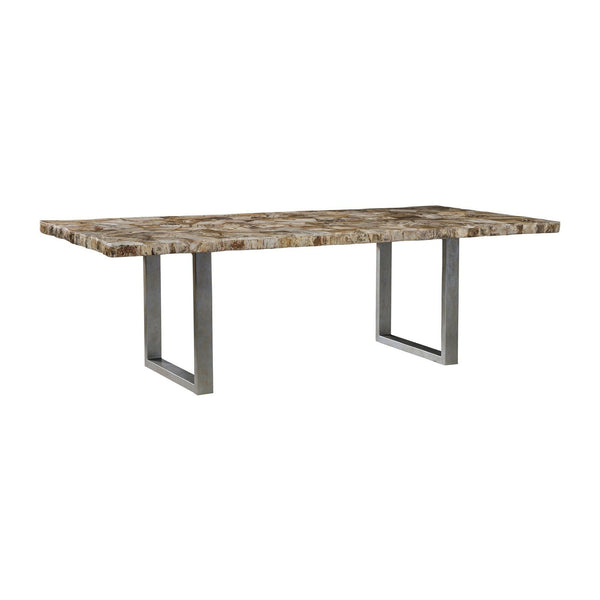 - Contemporary live-edge dining table featuring a slab top two inches thick, inlaid with fossilized White Clam shell and standing on simple iron sled bases in a silver finish with a hint of gold.