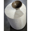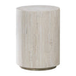 - Contemporary drum spot table veneered in White Vein travertine standing on iron plinths in a silver metallic finish.