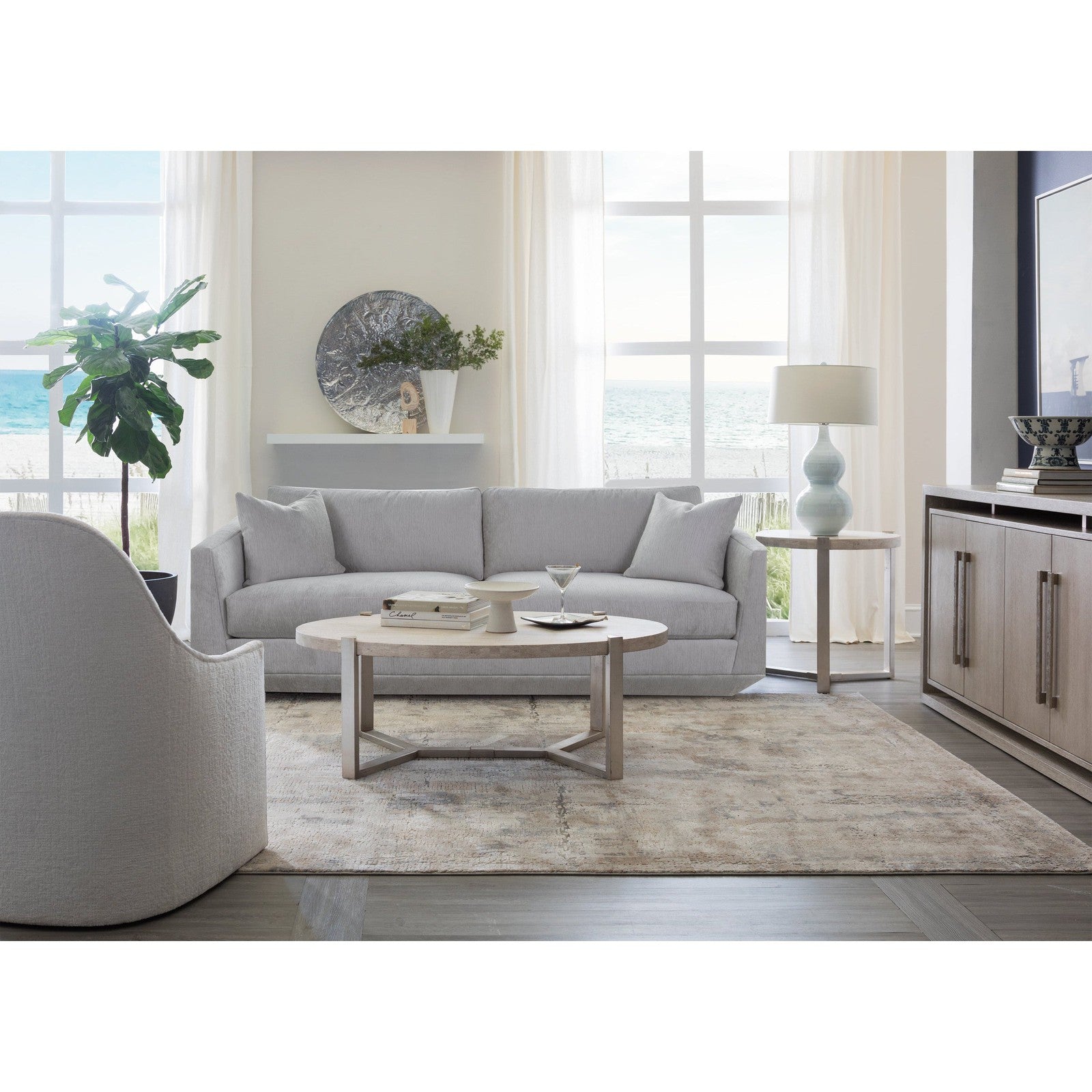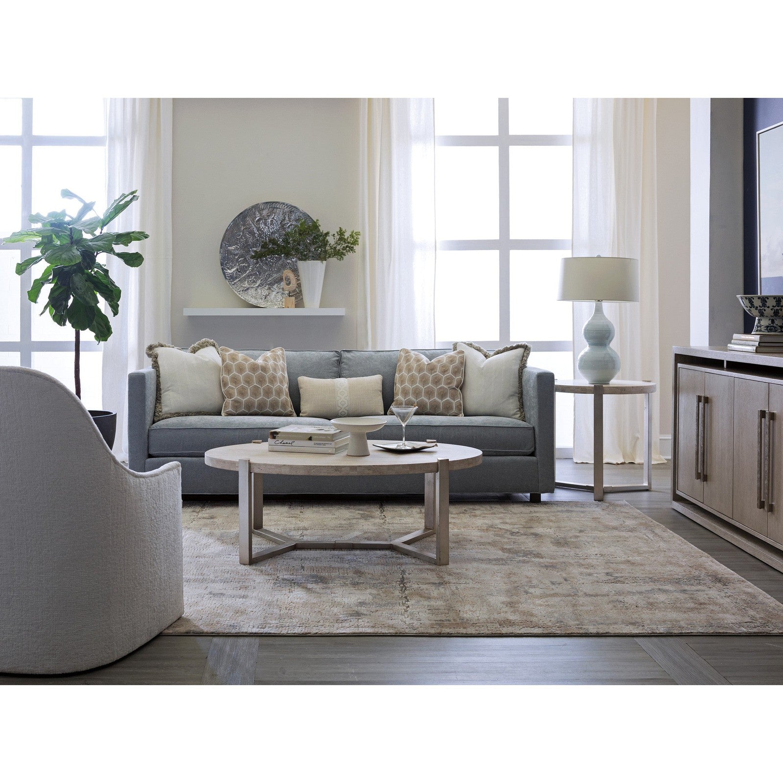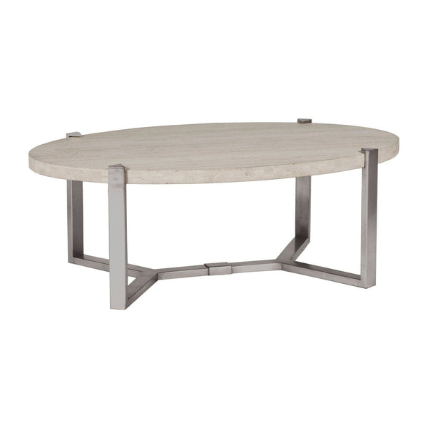 - Versatile contemporary cocktail table featuring a honed White Vein travertine top standing on an iron base in a champagne silver leaf finish.