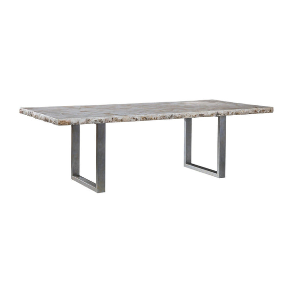 - Contemporary live-edge dining table featuring a slab top two inches thick, inlaid with fossilized White Clam shell and standing on simple iron sled bases in a silver finish with a hint of gold.