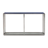 - Contemporary design with a glass top layered translucent shades of cerulean, cobalt and ultra marine suspended in a brushed stainless steel base with tempered glass shelf below.